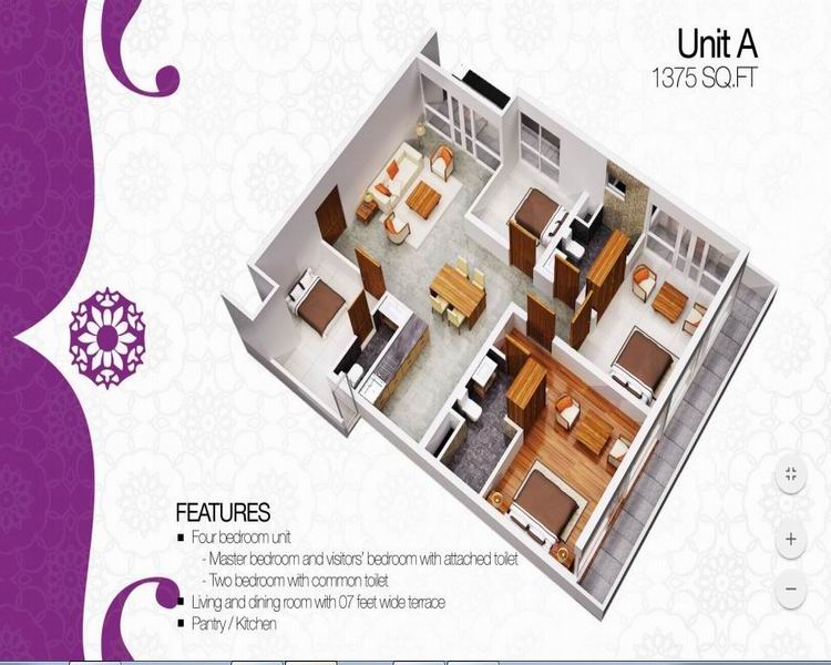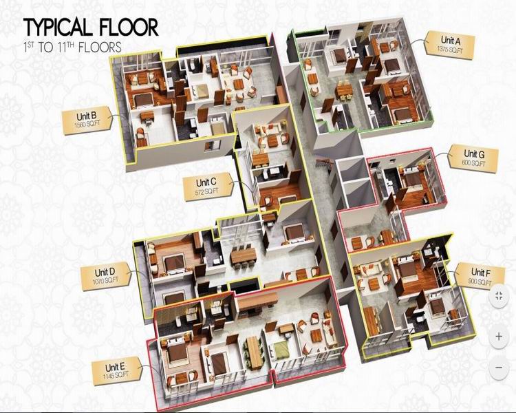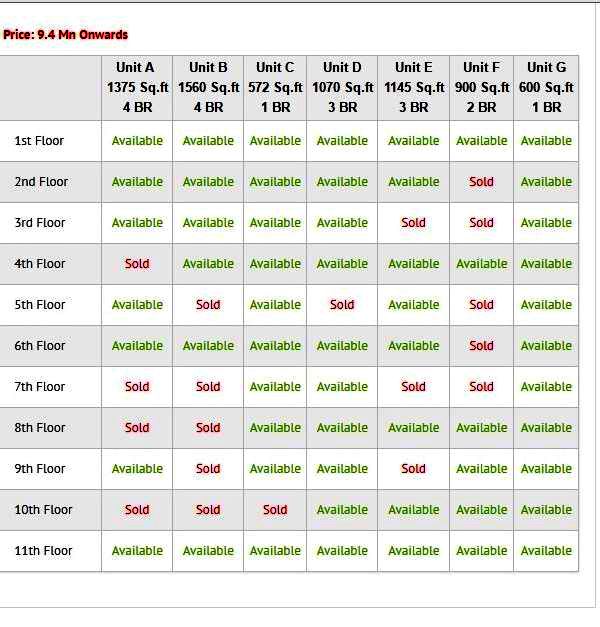 Air conditioners 01 each (with prov for other areas) Type A-04 Bed 1375 Sq.ft Electricity Three phase Type B-04 Bed 1560 Sq.ft Overhead tank Centralized Type C-01 Bed 572 Sq.ft Hot water yes Type D-03 Bed 1070 Sq.ft Geezers 02 each Type E-03 Bed 1145 Sq.ft TV points 03 each Type F-02 Bed 900 Sq.ft Floor Fully tiled Parking space: 01 vehicle per apt Width of roadway: 20 ft.